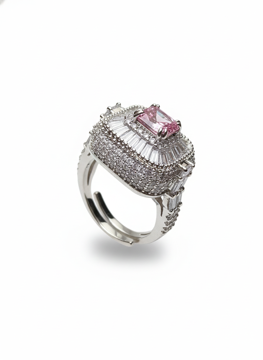 This ring features a radiant pink cushion-cut stone at its centre, surrounded by tiered halos of sparkling baguettes and pavé diamonds that rise like a regal crown. The intricate detailing along the band adds an extra touch of sophistication, creating a look that is both luxurious and feminine. A statement piece that exudes grace, opulence, and timeless charm.
