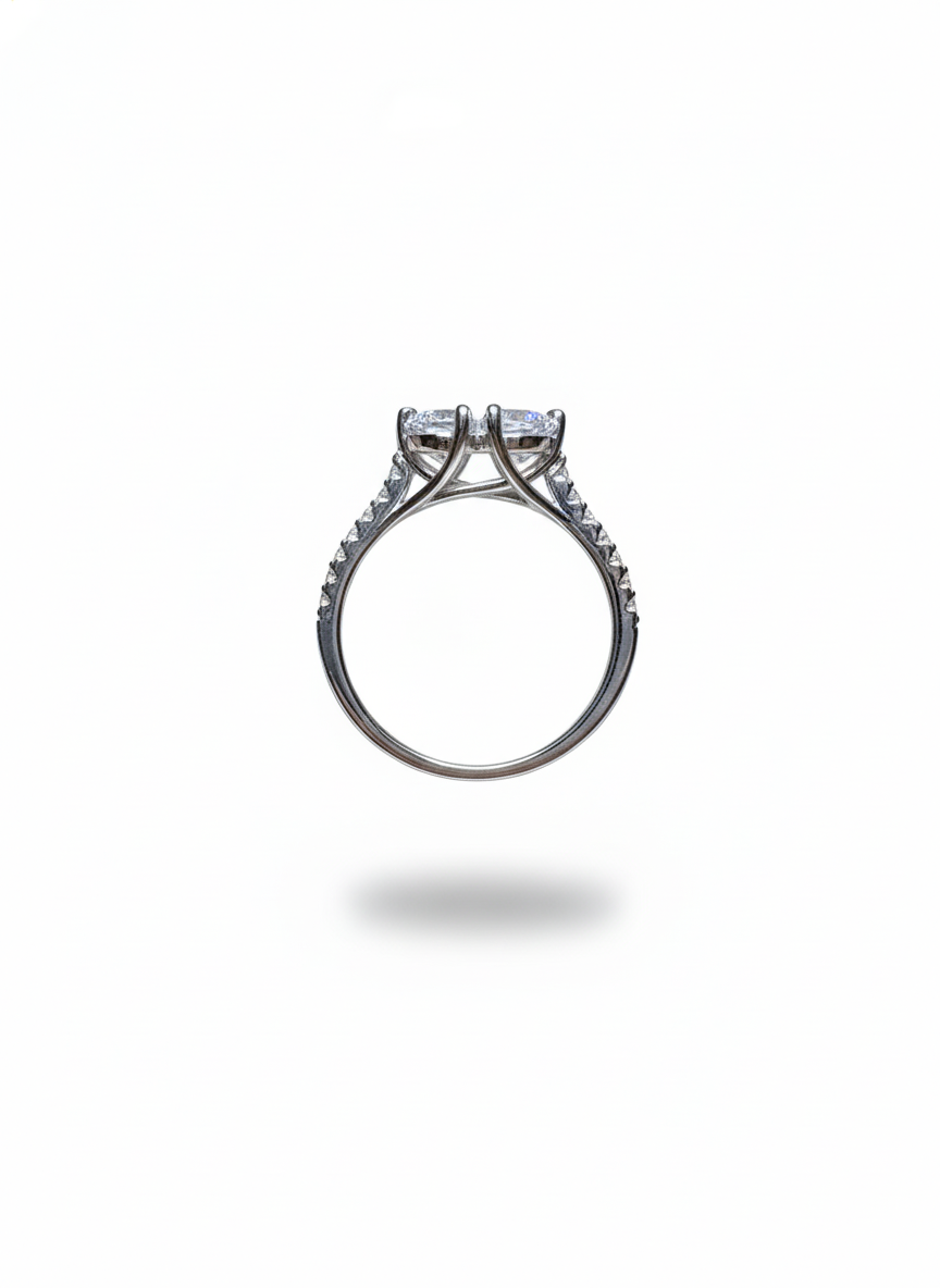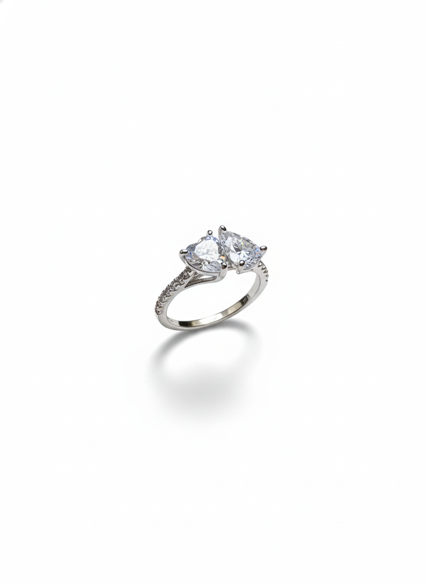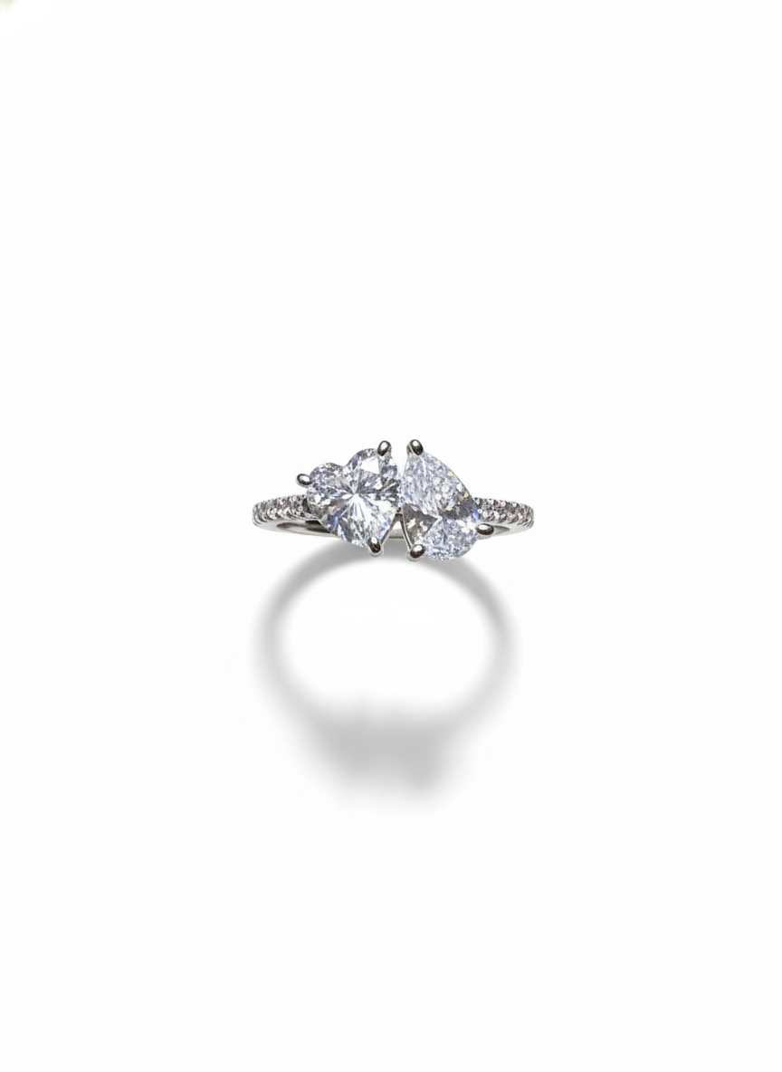 This ring features two radiant stones that sit side by side in perfect harmony, connected by a slim, pavé-lined band that adds just the right touch of sparkle. The asymmetrical pairing creates a modern, graceful silhouette that feels both delicate and distinctive. Light, elegant, and effortlessly chic—it’s a refined statement of understated luxury.