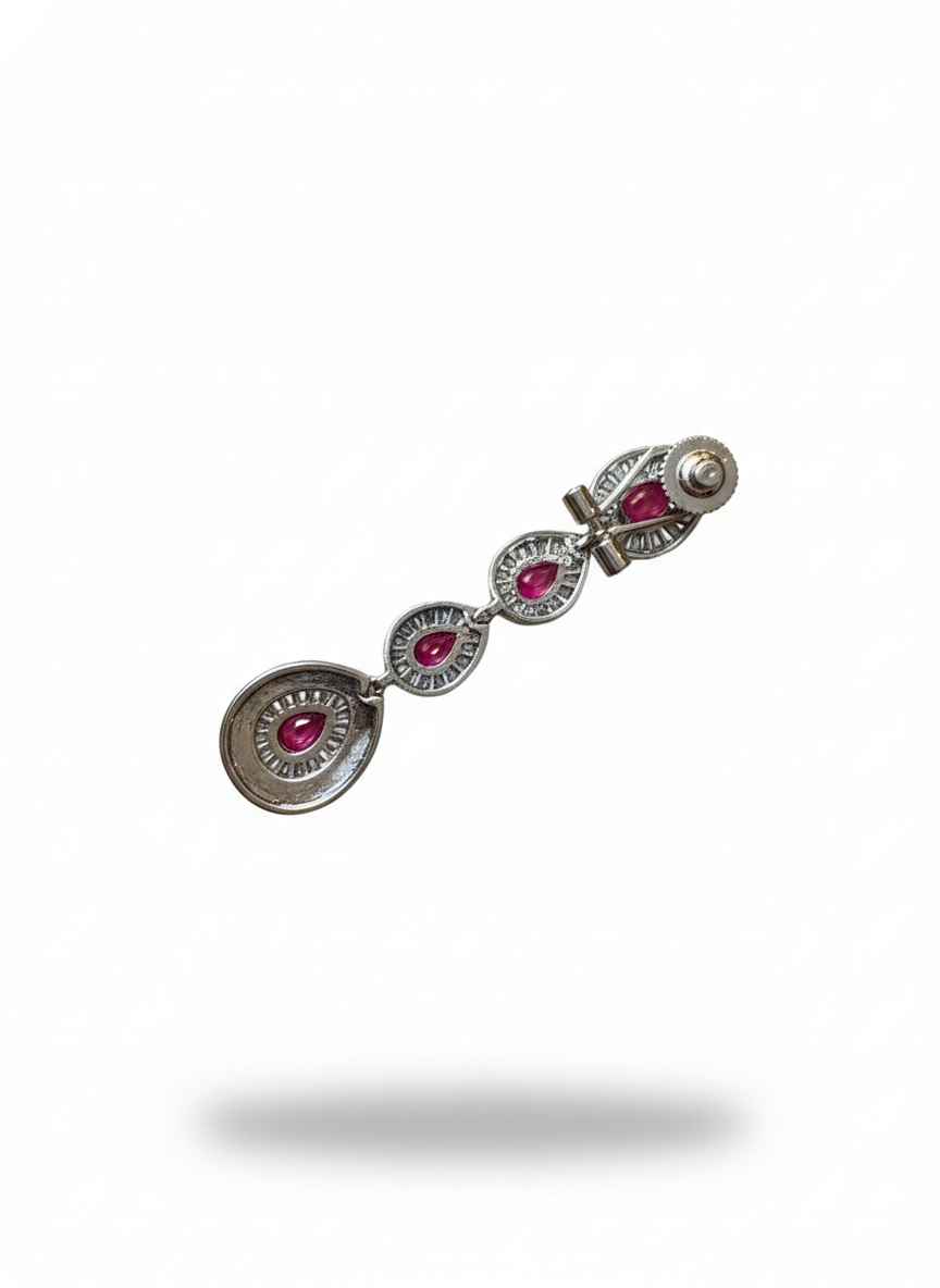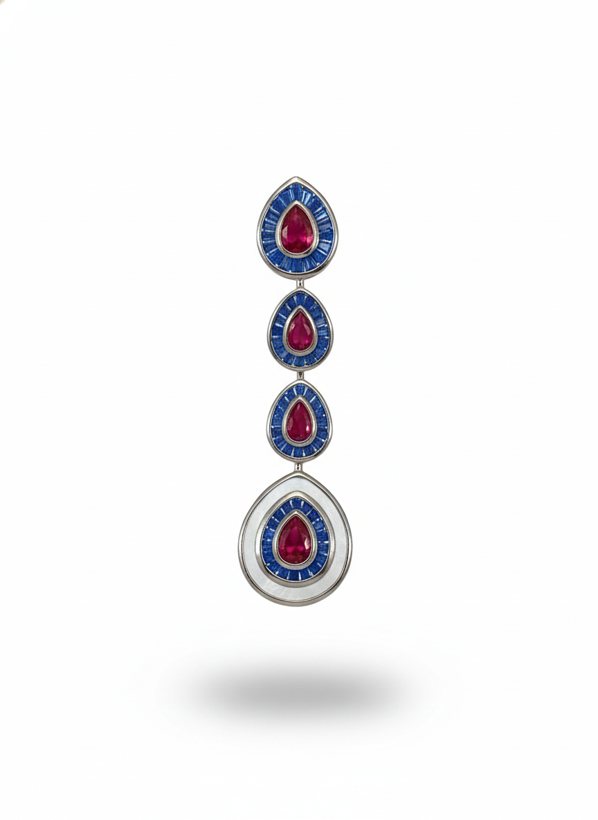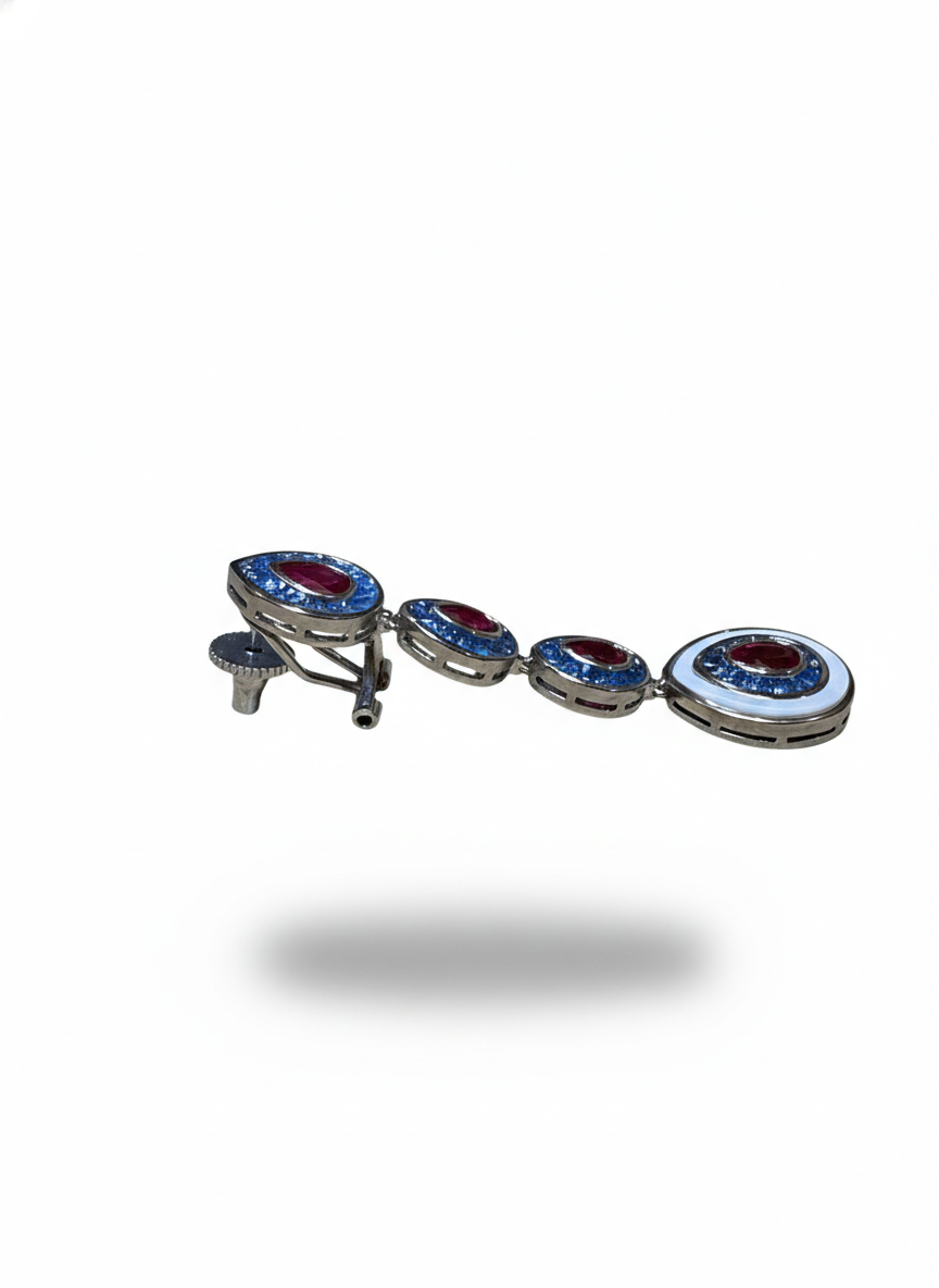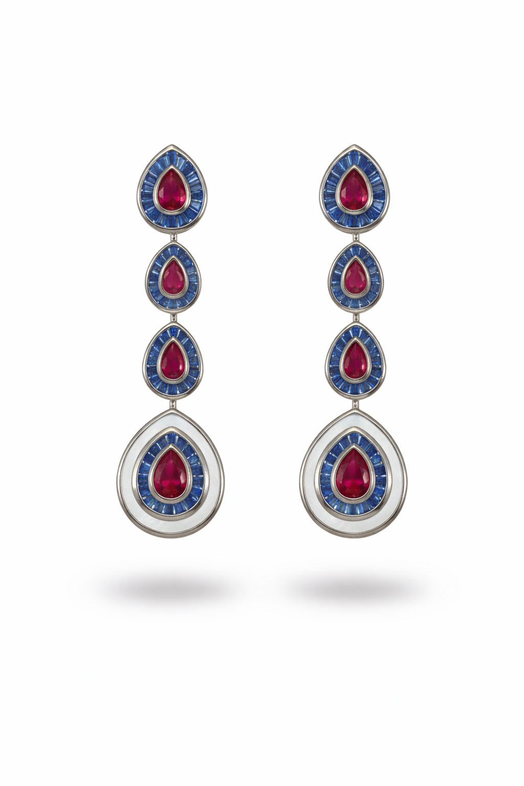 These striking earrings feature cascading teardrop motifs, each set with a vivid ruby-red center framed by blue enamel and shimmering stones. The bold color pairing creates a regal, peacock-inspired elegance, while the graduated design adds graceful movement. Artistic, vibrant, and royally refined—perfect for making a statement that feels both traditional and contemporary.