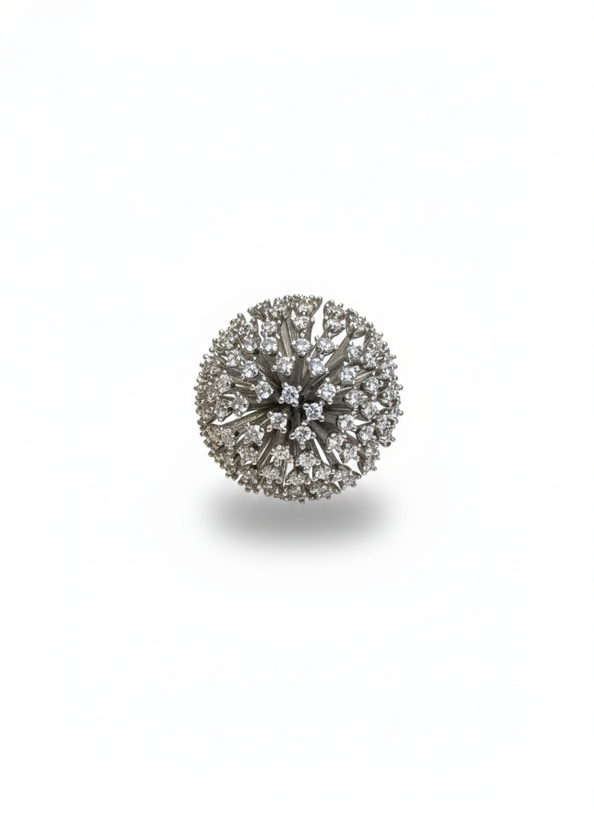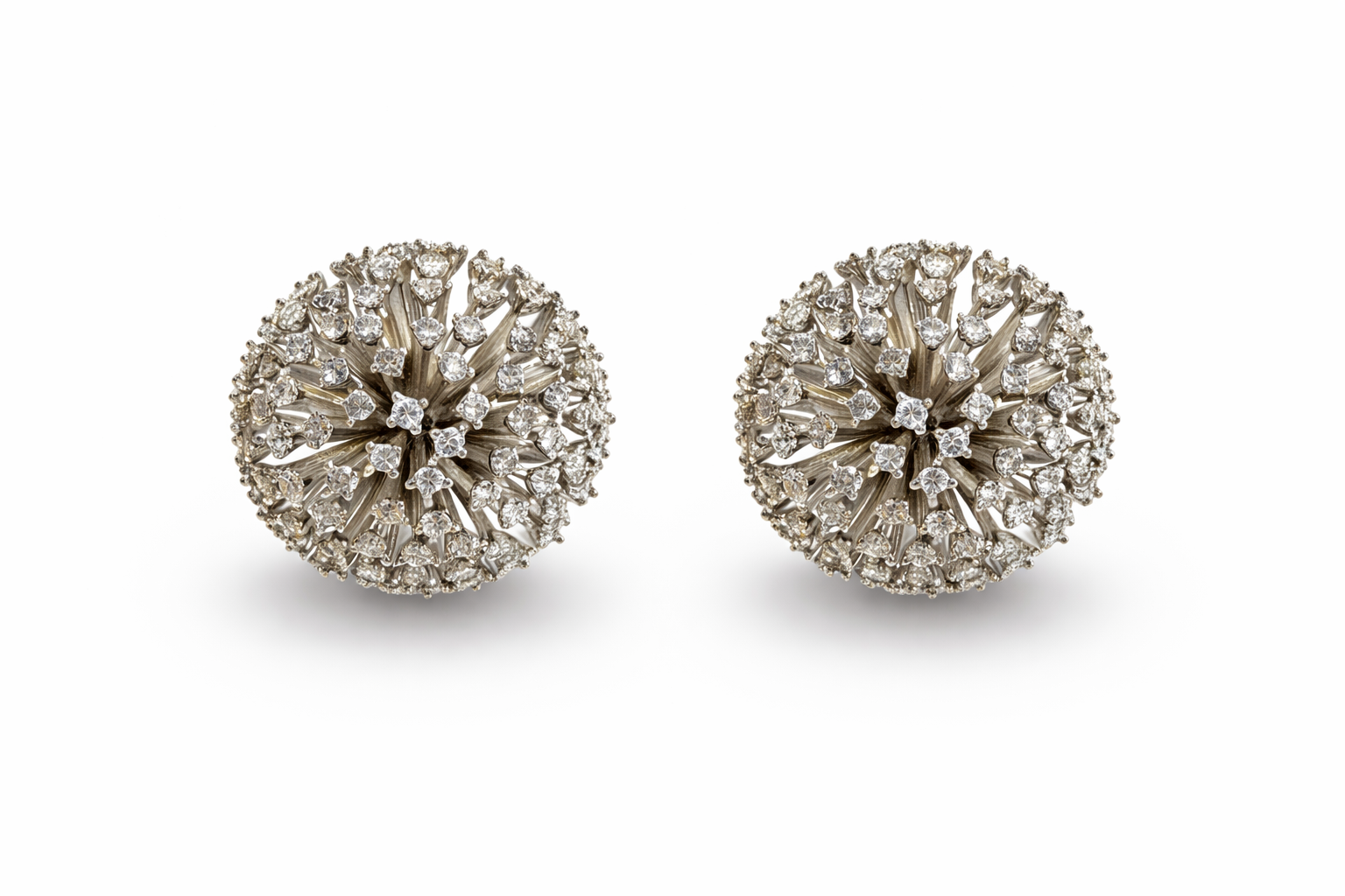 These dazzling round earrings burst with a constellation of shimmering stones arranged in a radiant floral sphere. Their intricate, multi-layered sparkle creates the effect of a starry bloom captured in motion. Bold yet timeless, they elevate any look with effortless glamour and luminous sophistication.