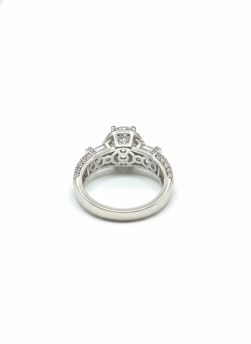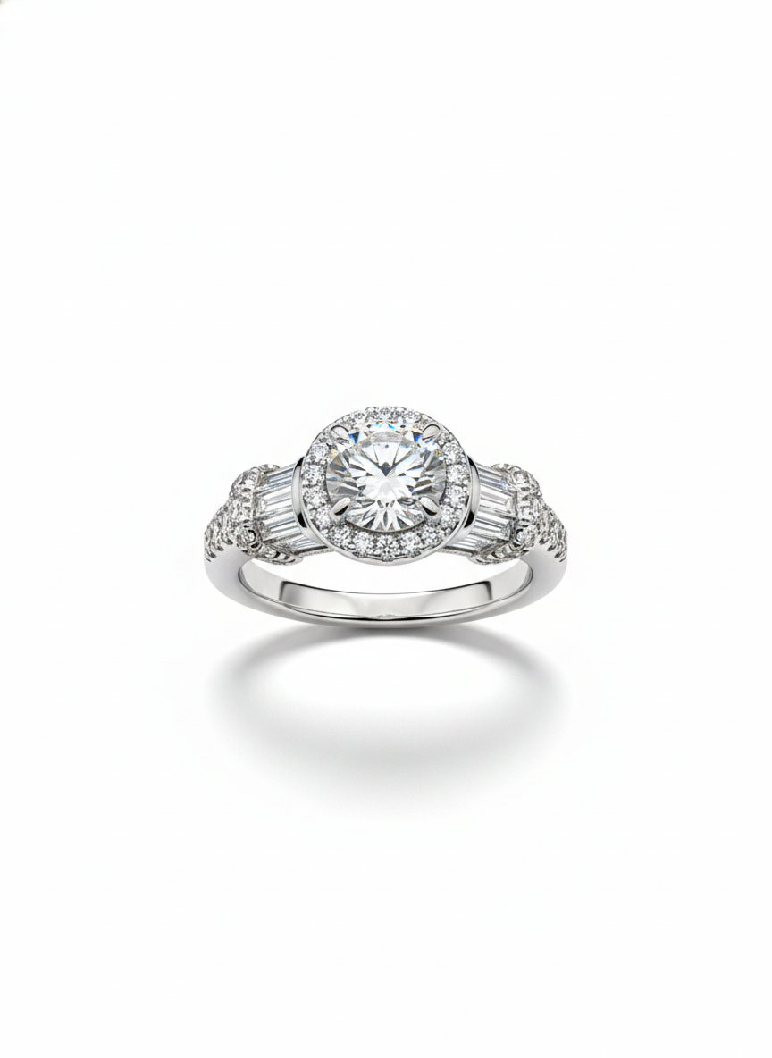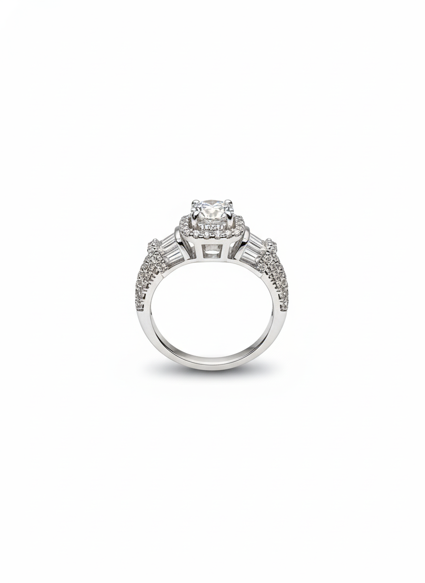 This ring features a brilliant marquise-cut centre stone encircled by a delicate halo, giving it a luminous, elongated sparkle. The band is adorned with a blend of pavé and baguette stones, adding depth, refinement, and modern elegance. Sophisticated, radiant, and timeless—this piece captures light beautifully from every angle.