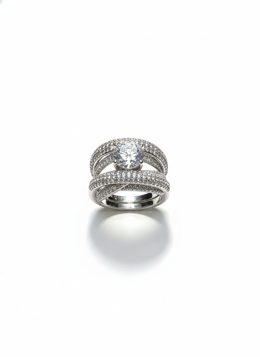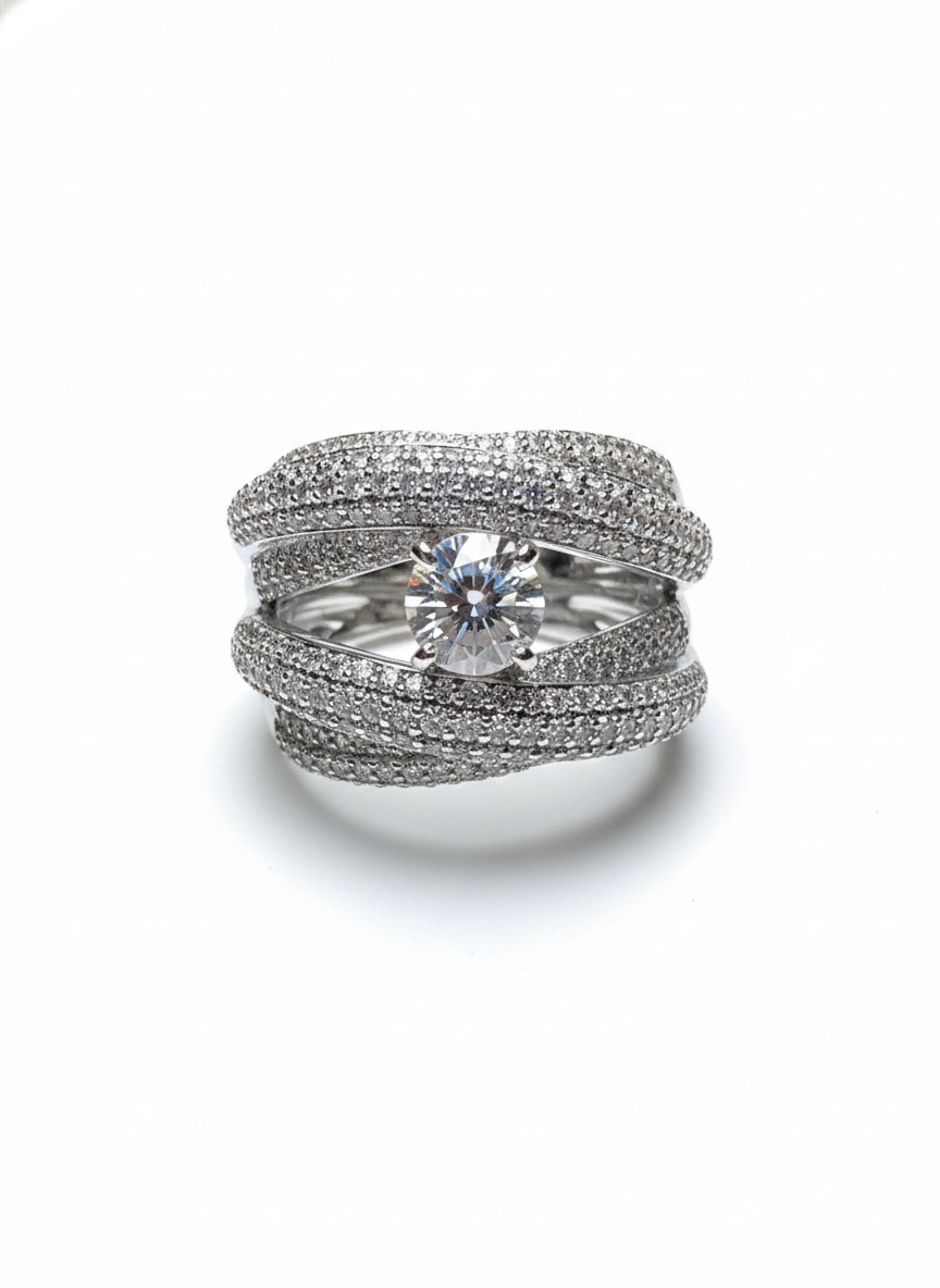 This ring features an enchanting twist-band silhouette, its curves fully adorned with shimmering pavé stones that flow like ribbons of light. At its centre rests a brilliant round gemstone, elevated gracefully as if floating between the intertwined bands. The design feels modern yet timeless—bold, sculptural, and effortlessly sophisticated.