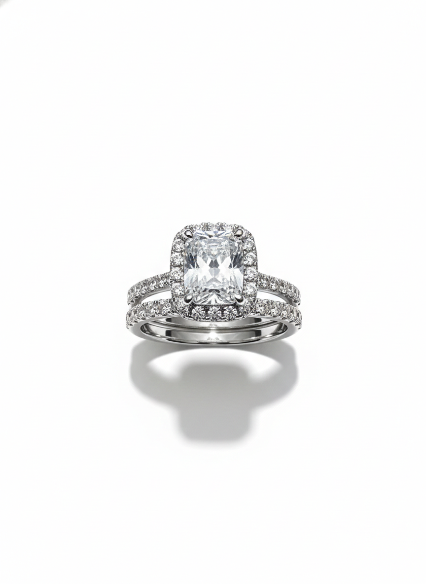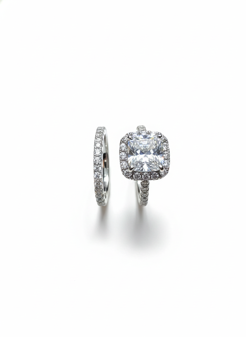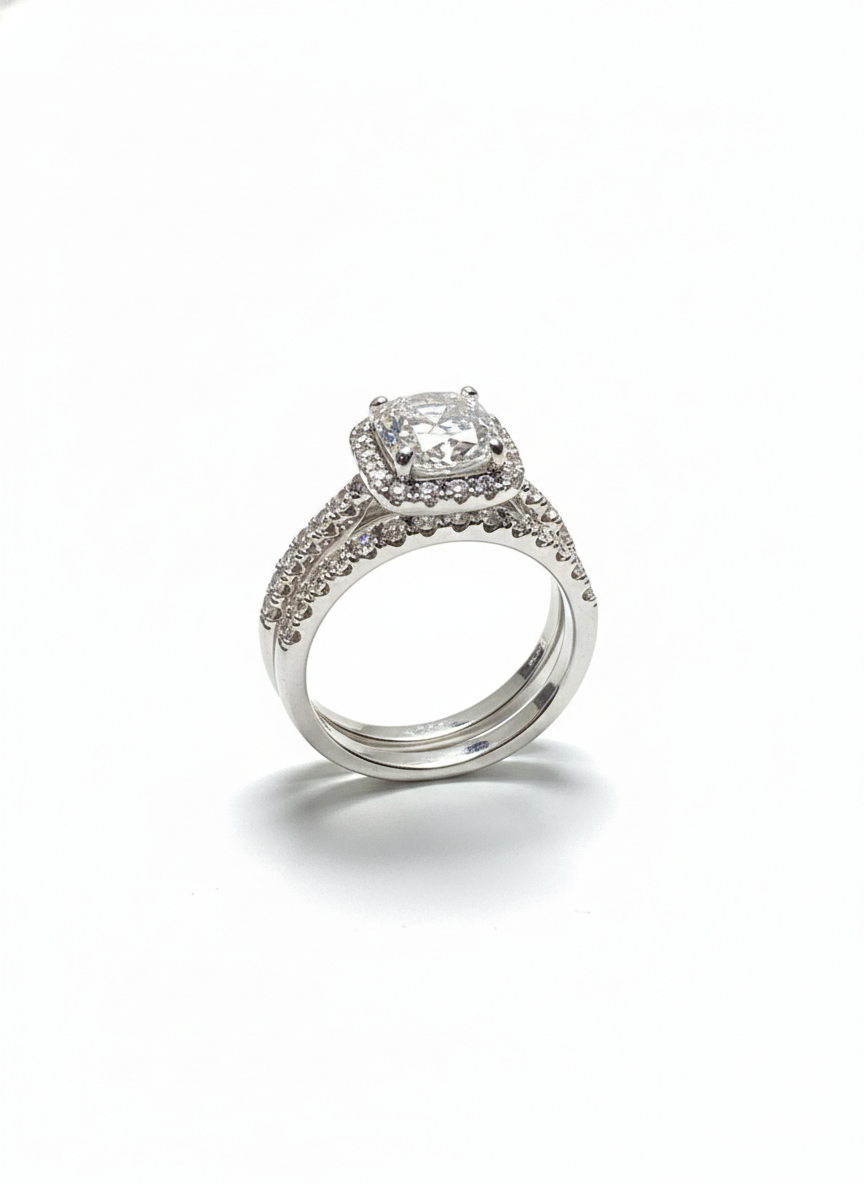 This stunning duo features a cushion-cut center stone encircled by a brilliant halo that magnifies its fire and clarity. Paired with a slender, pavé-set band that sparkles with understated elegance, the set creates a perfect harmony of brilliance and refinement. Timeless, graceful, and luminous—this ring embodies classic luxury with a modern finish.