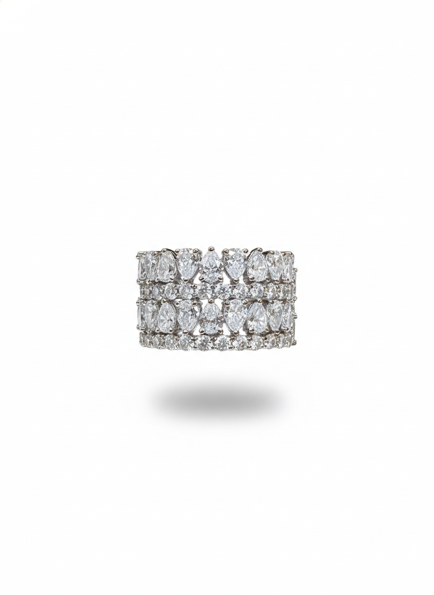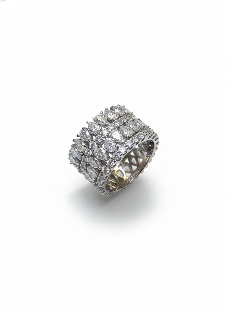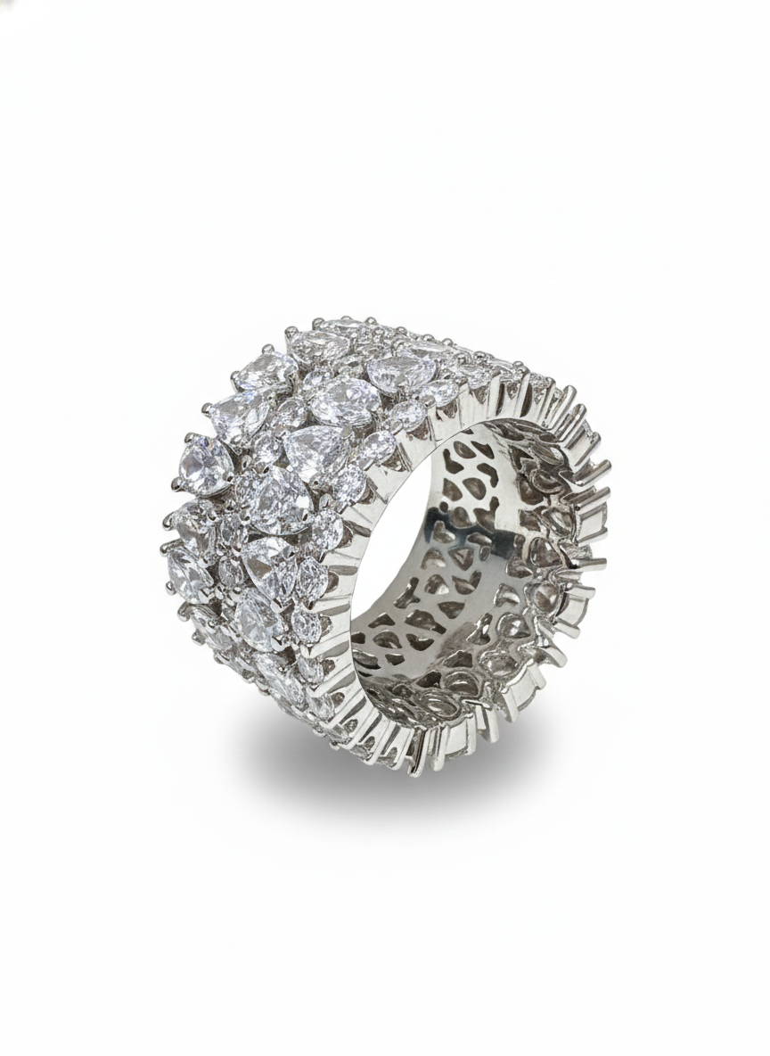 This ring shines with four rows of beautifully arranged stones, creating a seamless ribbon of brilliance around the finger. Its wide, luxurious band sparkles with every movement, offering a look that is both timeless and boldly glamorous. A perfect blend of elegance and statement-making sparkle, it embodies sophistication in its purest form.