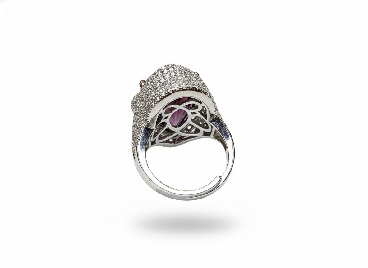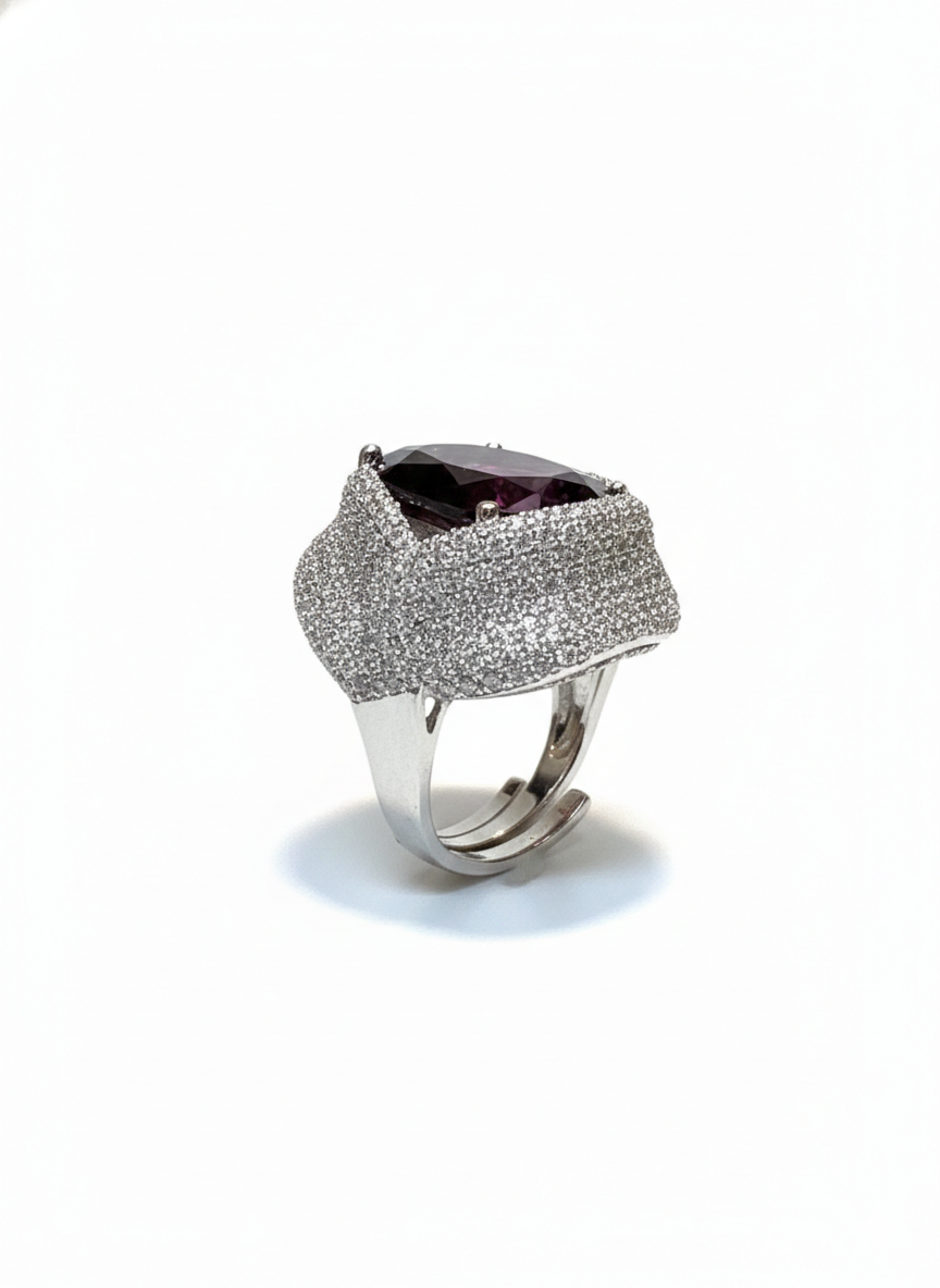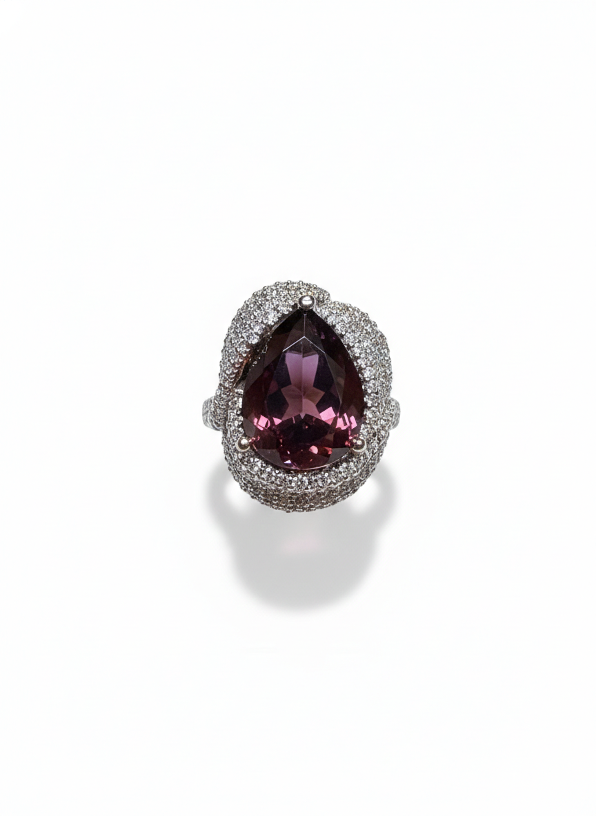 A bold statement of luxury, this ring showcases a deep, teardrop-shaped gemstone that glows like a captured ember. Wrapped in layers of shimmering pavé detailing, the design feels almost sculptural—like a precious jewel emerging from a field of light. It’s dramatic, opulent, and impossible to overlook.