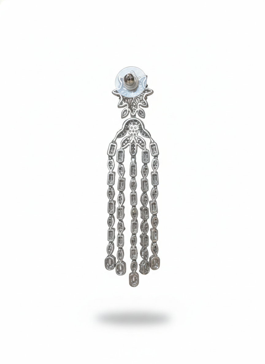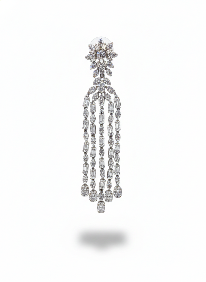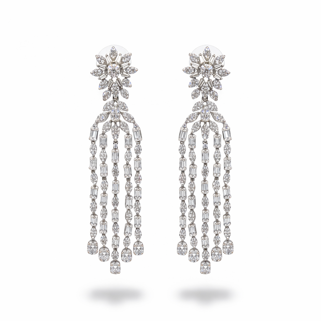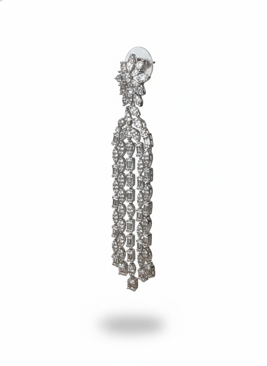 These earrings shimmer with cascading rows of brilliant stones that flow like a waterfall of light. Each strand sways gracefully with movement, catching radiance from every angle, while the floral cluster at the top adds a touch of delicate charm. Luxurious, dramatic, and impossibly elegant—they are made for moments that deserve to shine.