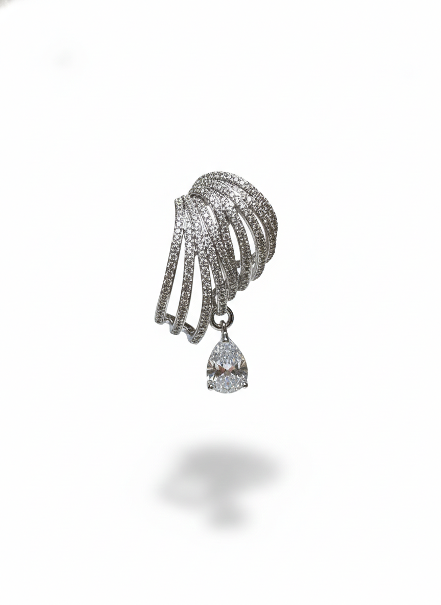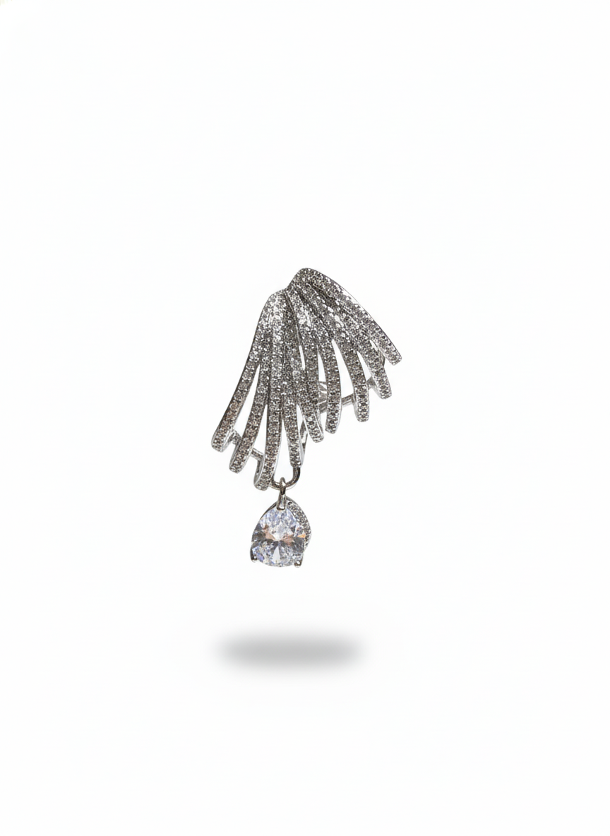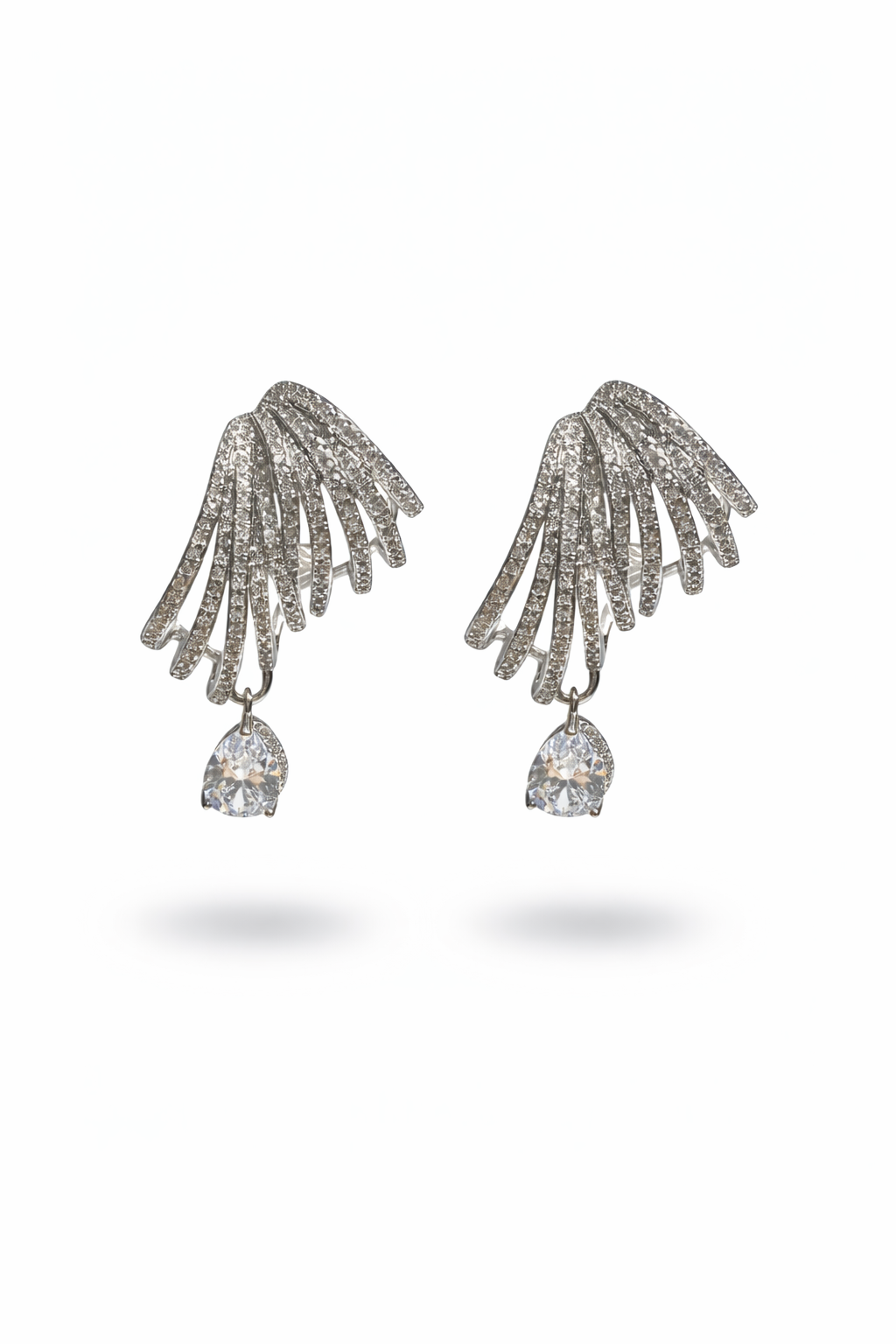 These earrings feature a radiant fan-like spray of pavé-set strands that open gracefully, creating a shimmering burst of light. From the center of each fan hangs a brilliant teardrop stone, adding movement and luxurious sparkle. Elegant, airy, and beautifully sculpted—these earrings feel like celestial wings catching the light with every turn.