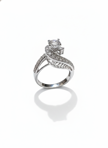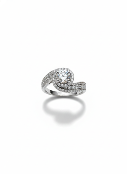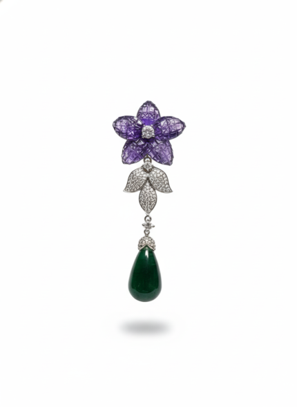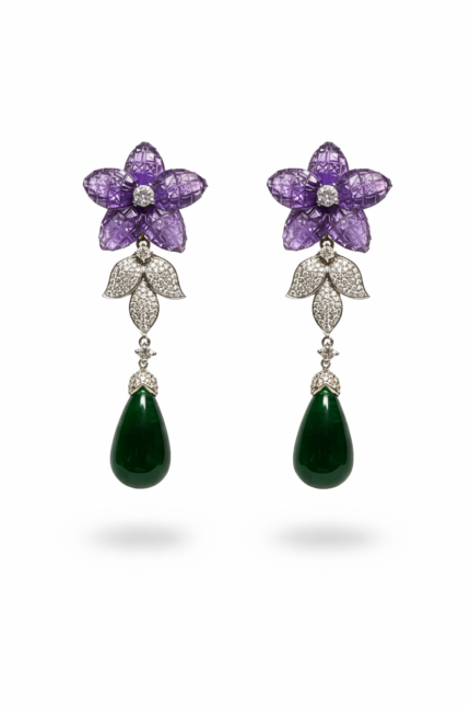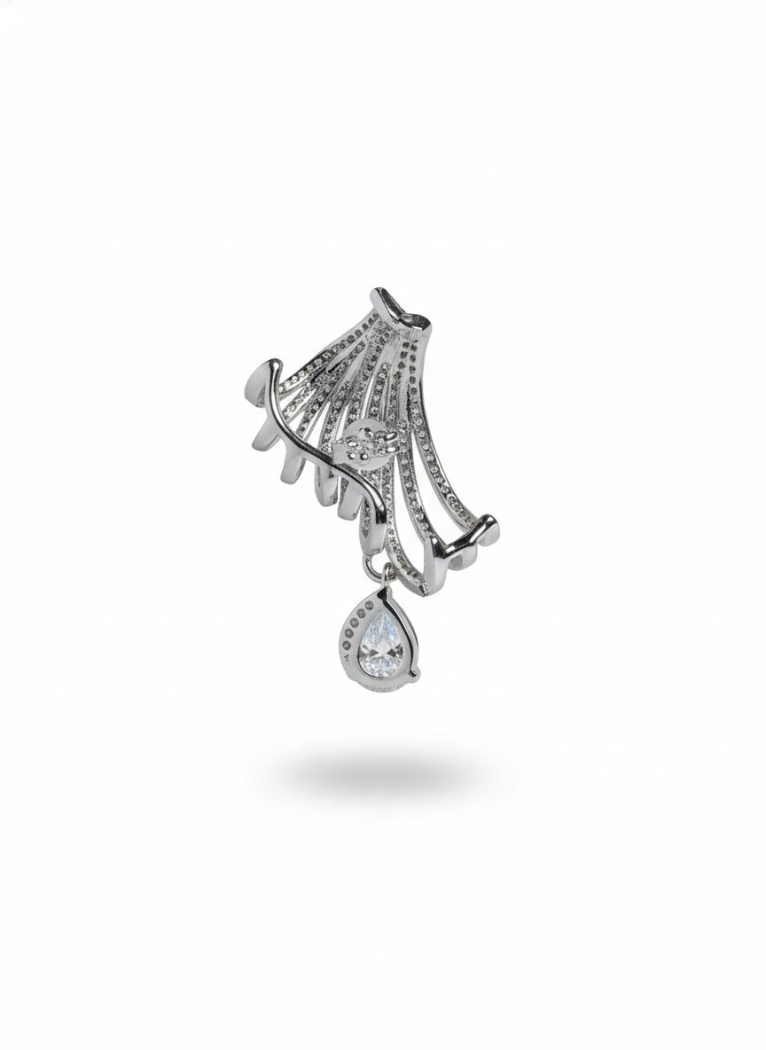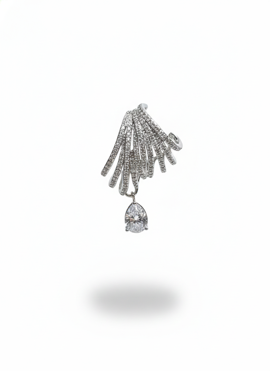 These earrings feature a radiant fan-like spray of pavé-set strands that open gracefully, creating a shimmering burst of light. From the center of each fan hangs a brilliant teardrop stone, adding movement and luxurious sparkle. Elegant, airy, and beautifully sculpted—these earrings feel like celestial wings catching the light with every turn.