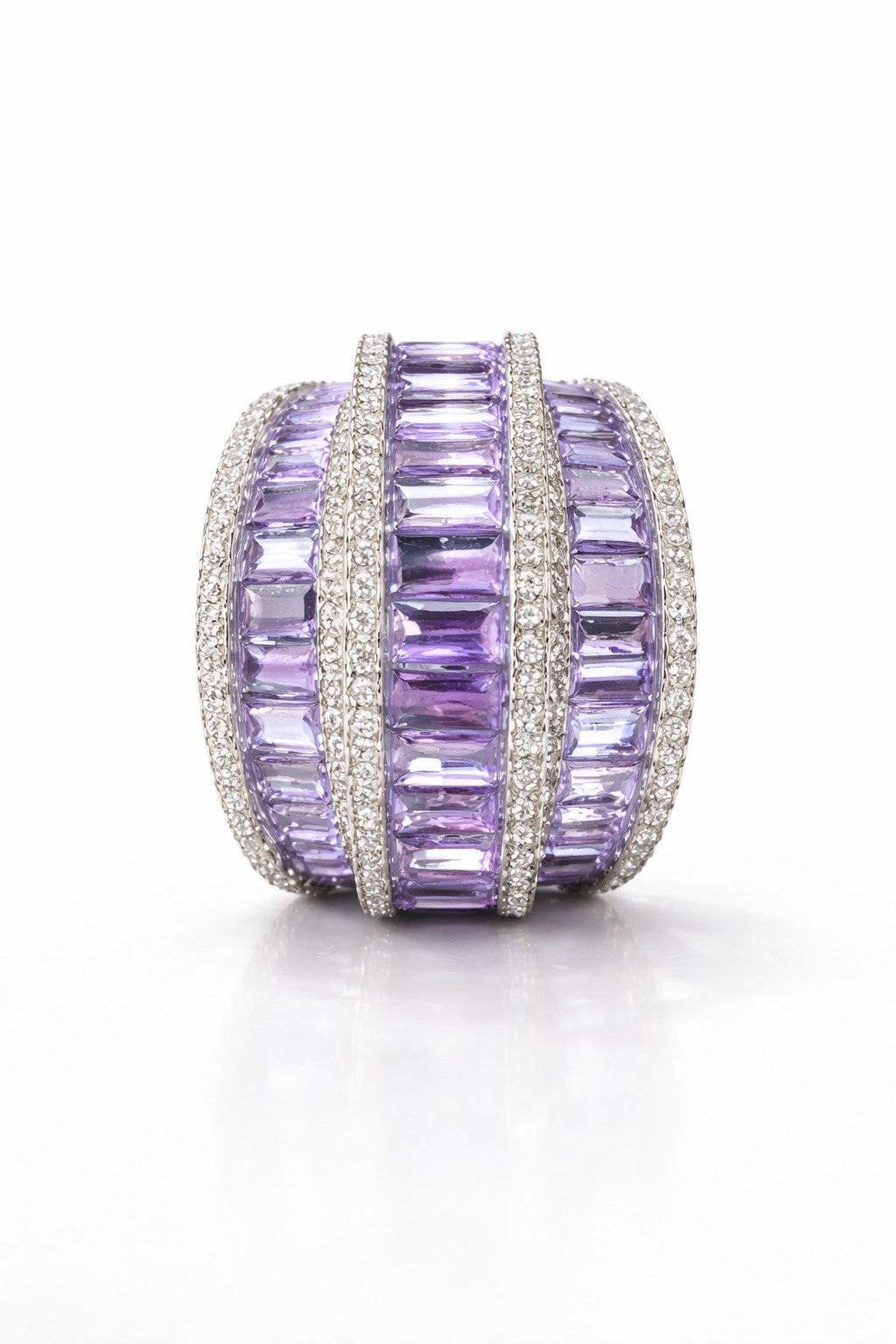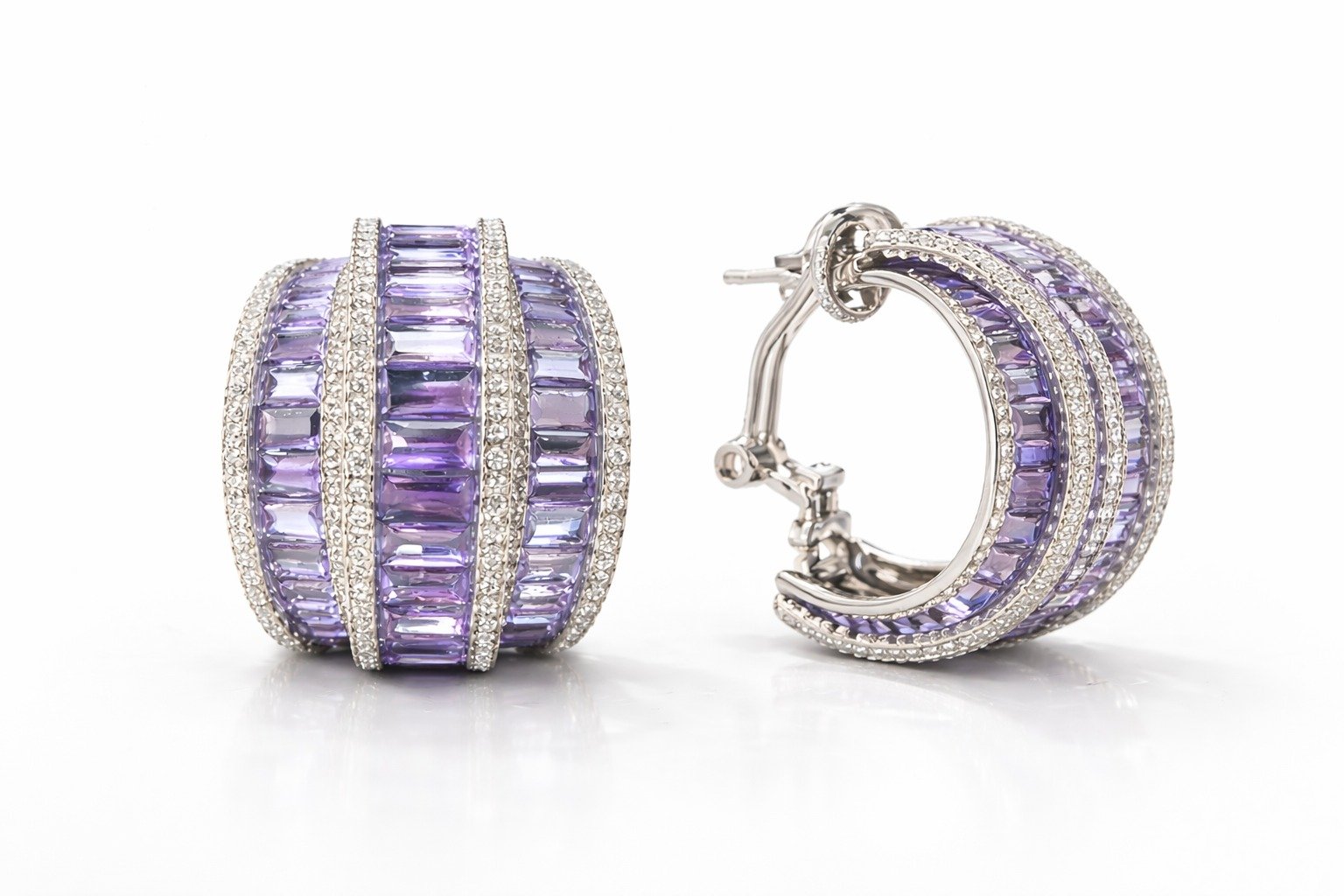 These exquisite hoops blend shimmering lavender baguettes with delicate pavé brilliance, creating a flowing ribbon of light around the ear. Their sculpted, overlapping bands echo the softness of an aurora’s glow, offering a luxurious yet modern touch. Feminine, luminous, and effortlessly striking, they elevate any ensemble with refined charm.