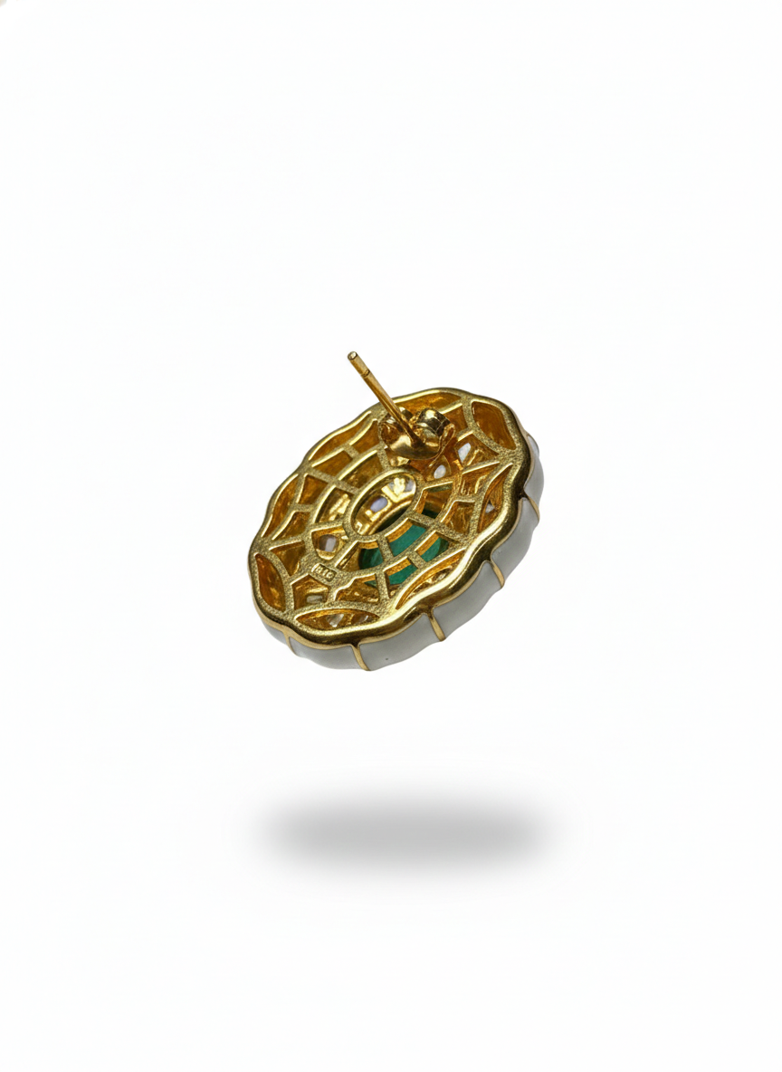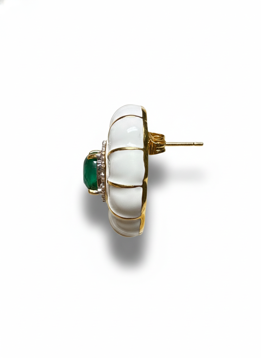 These striking studs feature a deep emerald center framed by radiant white enamel spokes and a halo of shimmering stones, creating a refined sunburst effect. Their bold yet timeless design brings together modern artistry and classic luxury—perfect for elevating any ensemble with effortless elegance.