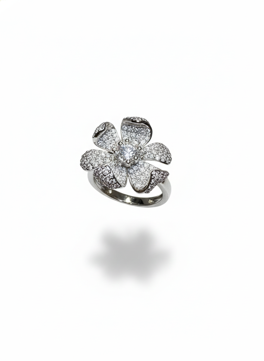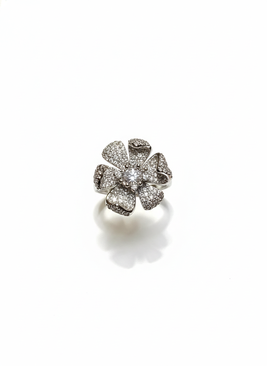 This ring blooms with a sparkling floral motif, each petal meticulously encrusted with pavé stones that catch the light from every angle. At its heart lies a brilliant central stone, glowing like the core of a freshly opened flower. Delicate yet dazzling, it brings together nature’s softness and timeless luxury in a beautifully sculpted design.