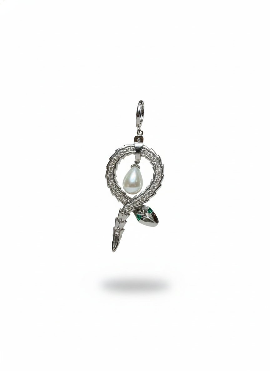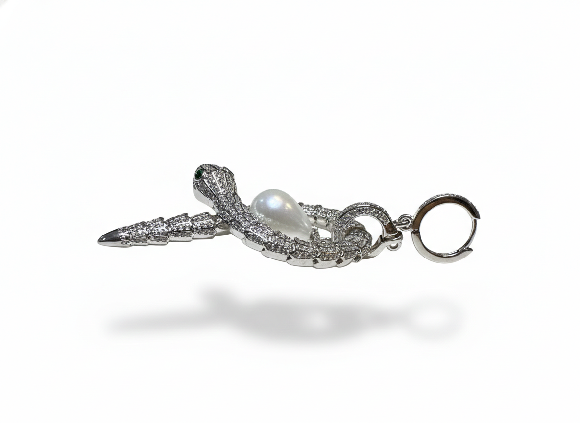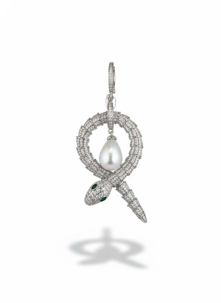 These striking earrings feature intricately pavéd serpents coiled into an elegant loop, each guarding a luminous teardrop pearl suspended at the center. The emerald-toned eyes and shimmering stones create a bold yet regal aura, while the fluid, sculptural shape adds a touch of mystique. Powerful, artistic, and opulent—these earrings command attention with every movement.