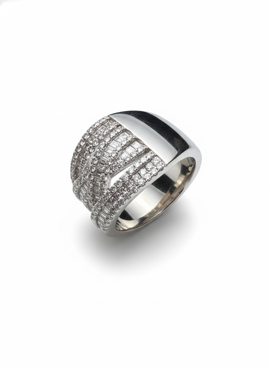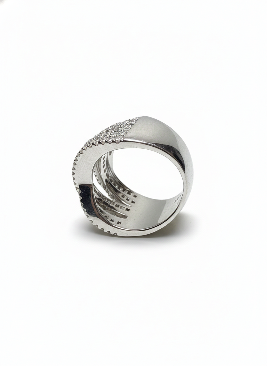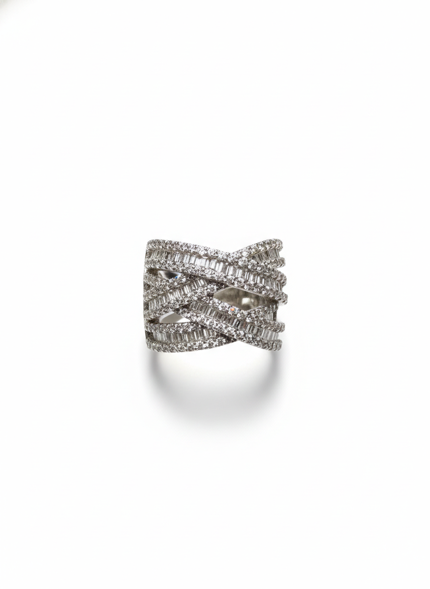 This ring features a dazzling criss-cross design, where rows of pavé stones sweep gracefully across one another, creating layers of shimmering movement. At the centre lies a single radiant stone, subtly anchored within the flowing structure. Modern, sculptural, and effortlessly elegant, it captures the beauty of light in motion.
