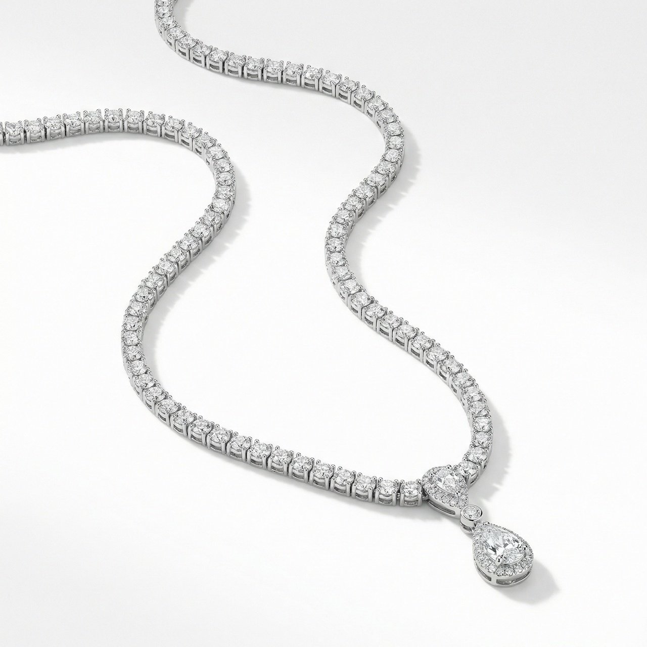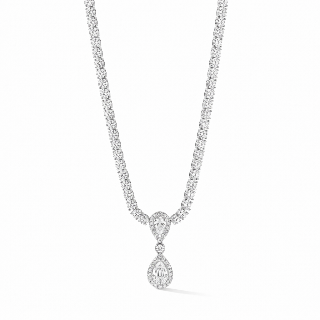 A timeless tennis-style necklace featuring a sparkling teardrop pendant, paired with matching earrings for a perfectly coordinated look. The stones catch the light beautifully, giving a soft, luxurious glow. Elegant, versatile, and effortlessly graceful—ideal for weddings, formal evenings, or adding a refined touch to any special occasion.